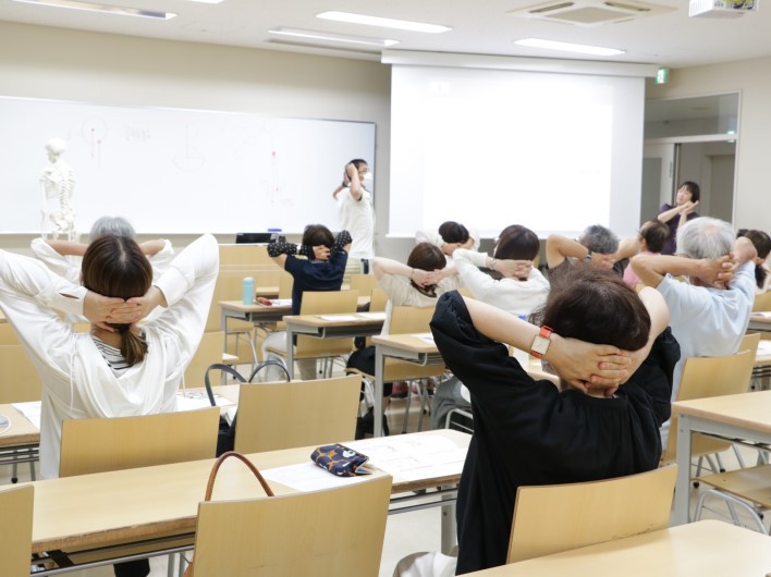 「姿勢制御」を研究の一つとしている冨田教授は、首こり・肩こり・腰痛が起きる仕組みを「姿勢」という観点で捉えて説明し、その上でその場でできる簡単な対処法を実践しました。