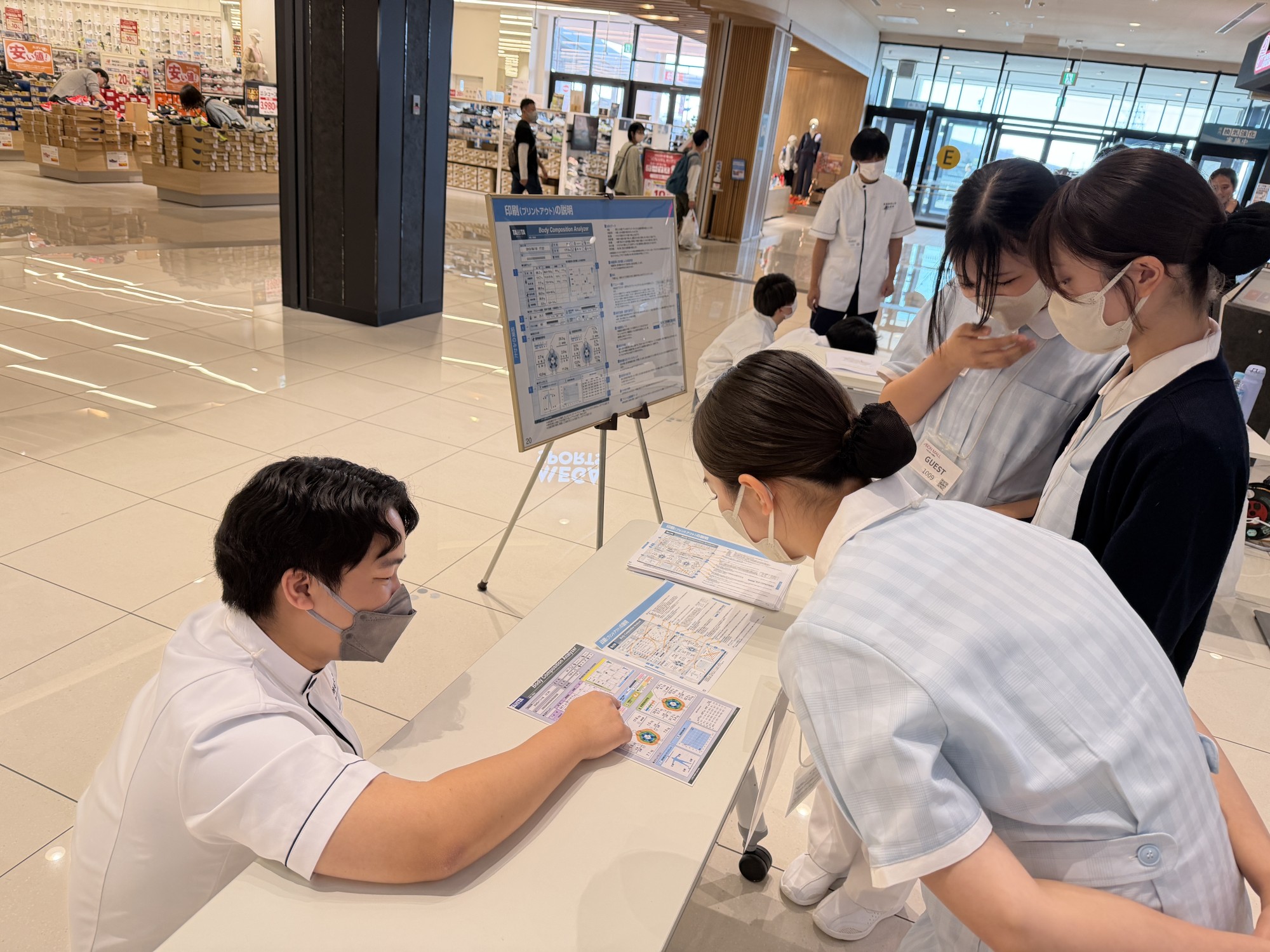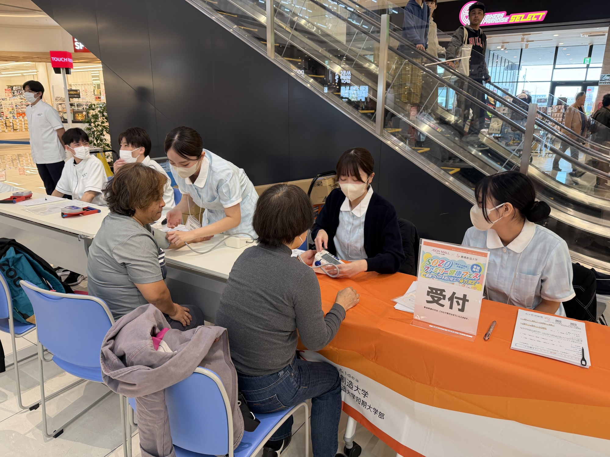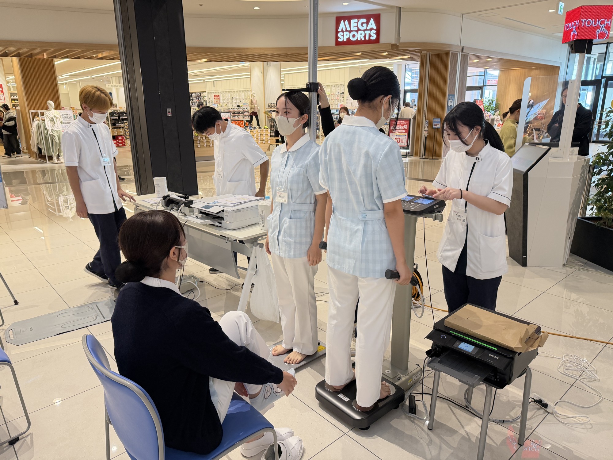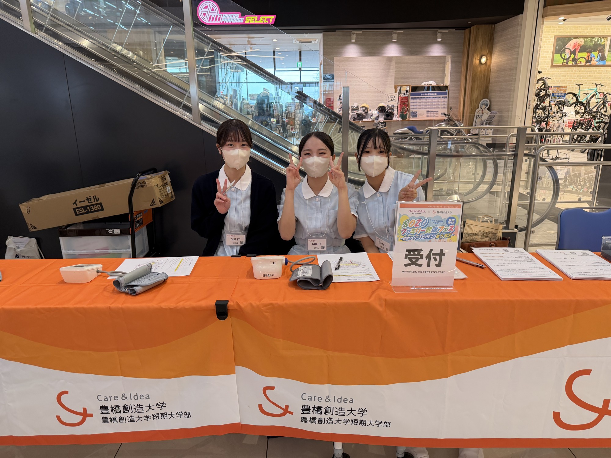 看護学科の学生が地域連携活動の一環として、イオンモール豊川で開催された「SOZOファミリー健康フェス」に参加しました。会場には多くの地域住民の方々が来場し、学生は来場者との交流を通じて、学びを深める貴重な機会となりました