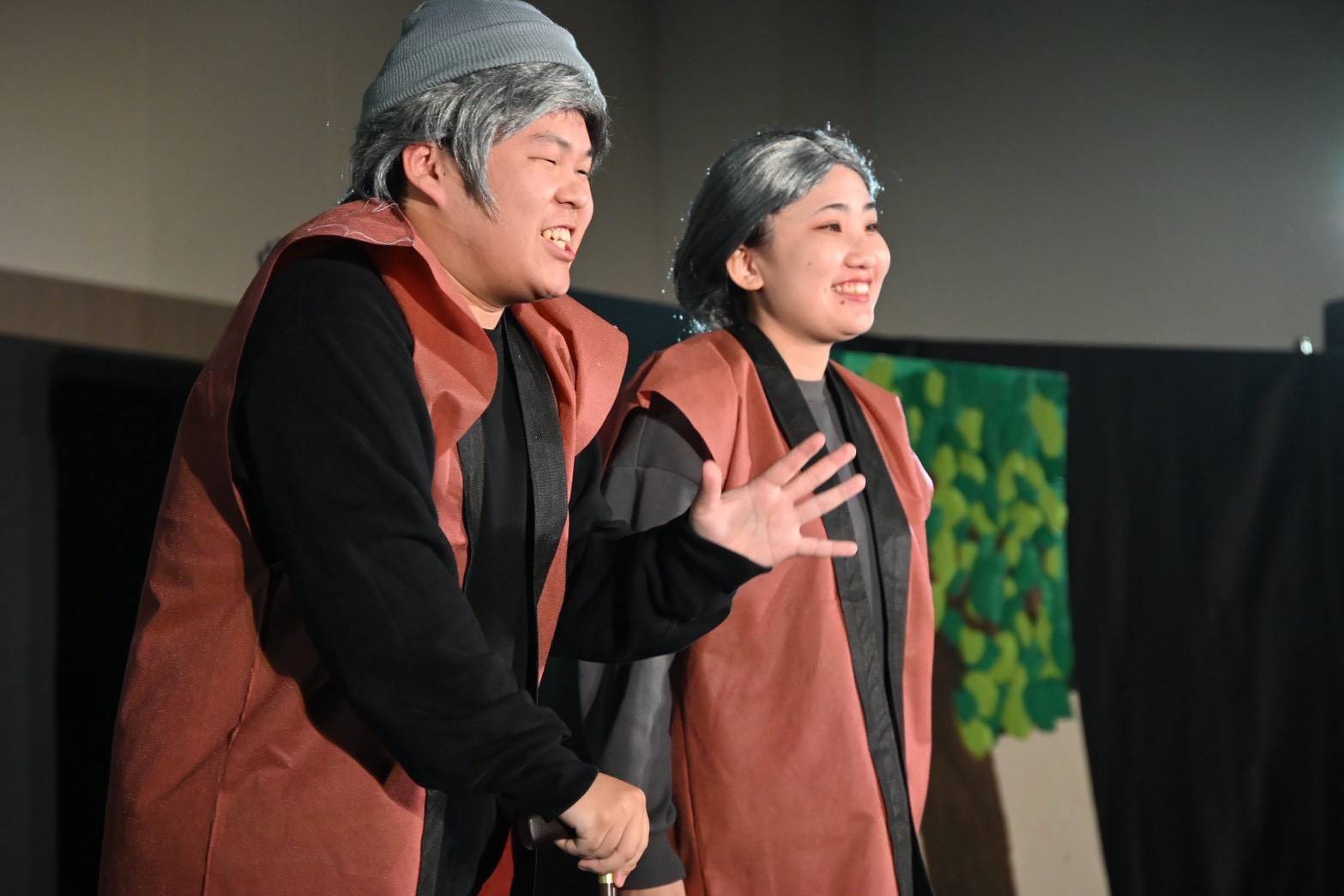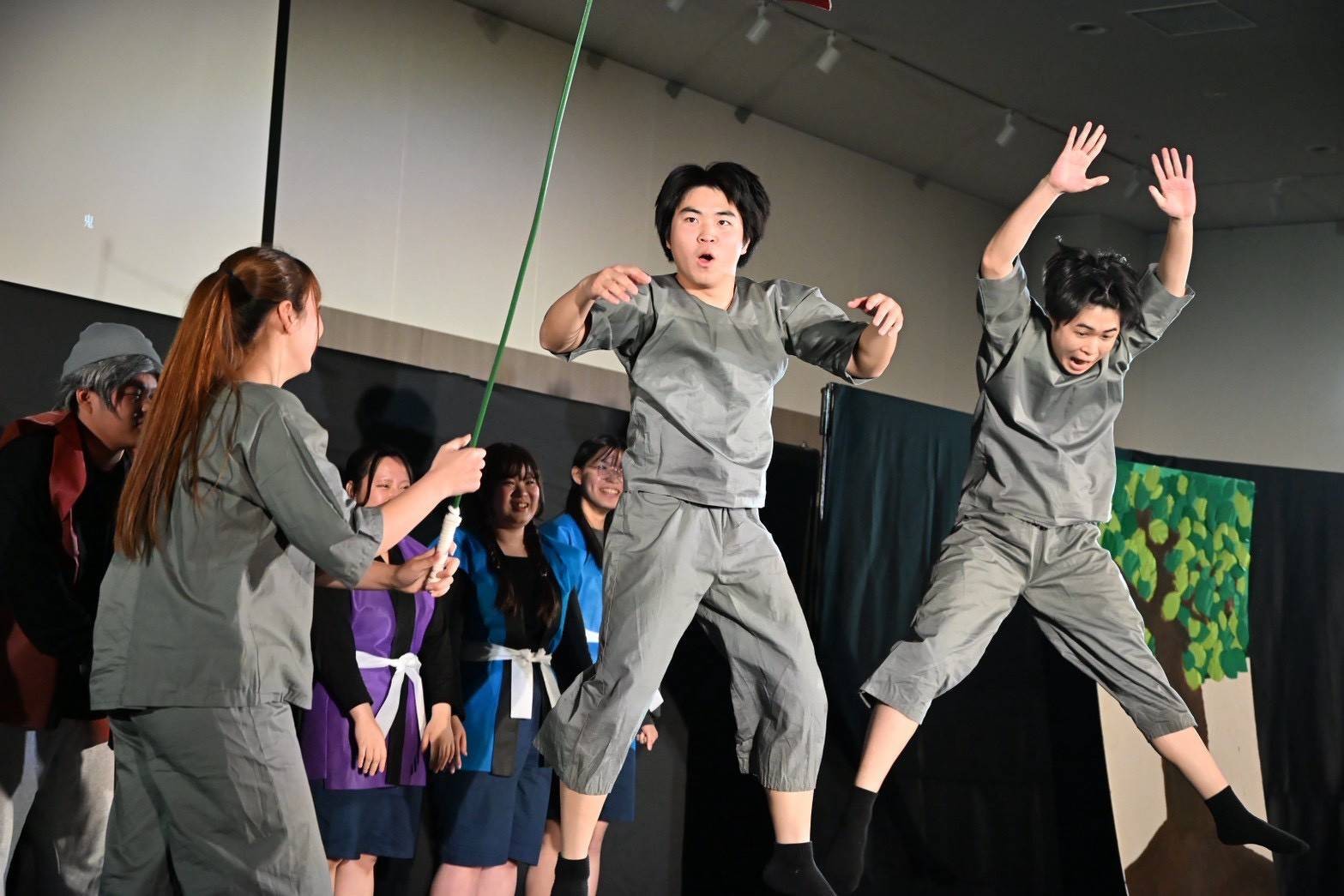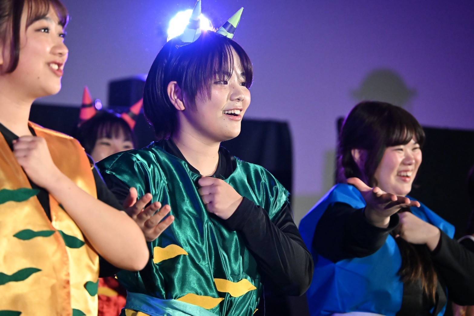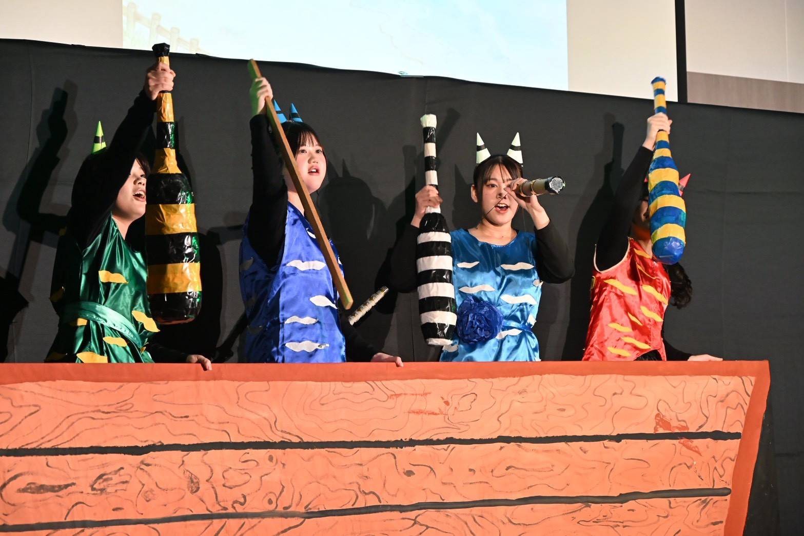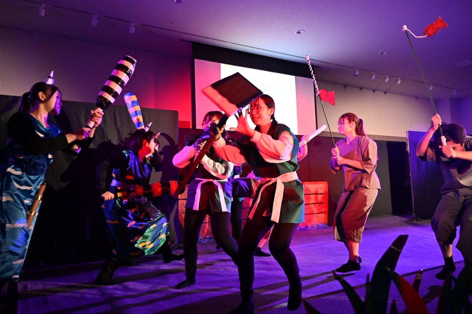2025年11/22土曜日にイオンモール豊川のイオンモールで「青い空フェスティバル」を開催しました。今年も経営学科、理学療法学科と連携しました。内容は「経営学科 SDGsゴミの分別クイズ」、「理学療法学科の子どもの成長を促す運動遊び」、そして幼児教育・保育科は創作ミュージカル「空島と鬼ヶ島の物語」を行いました。三学科の連携により、子どもたちと保護者の方々に真剣に鑑賞していただくことができ、学生たちの達成感が素晴らしいものとなりました。