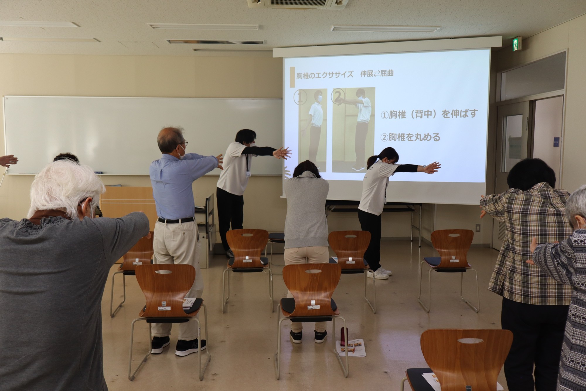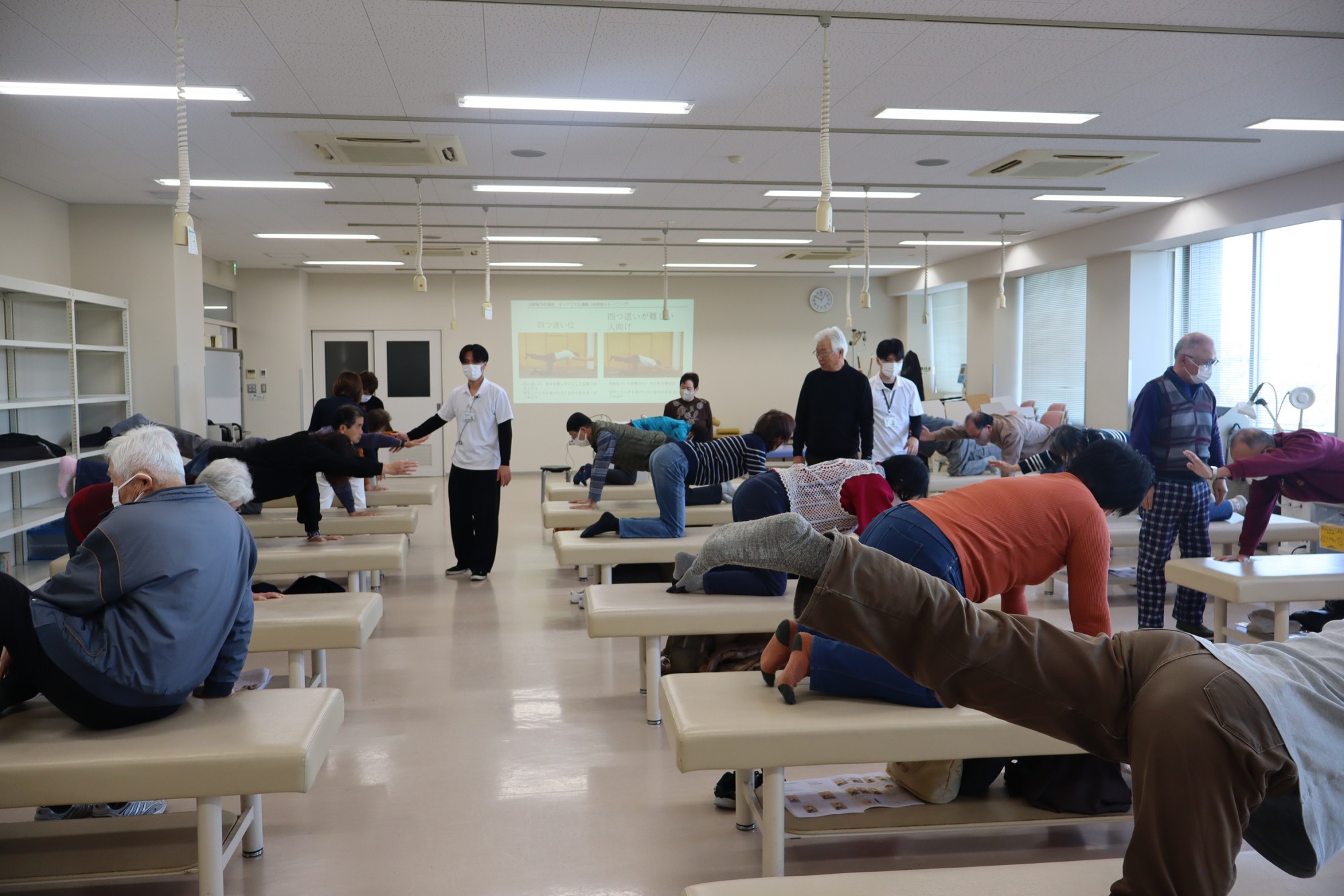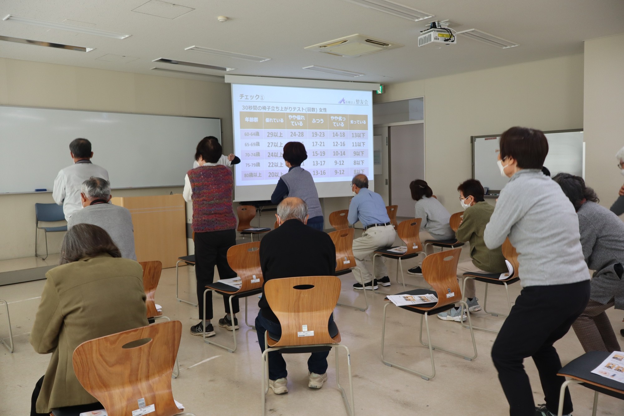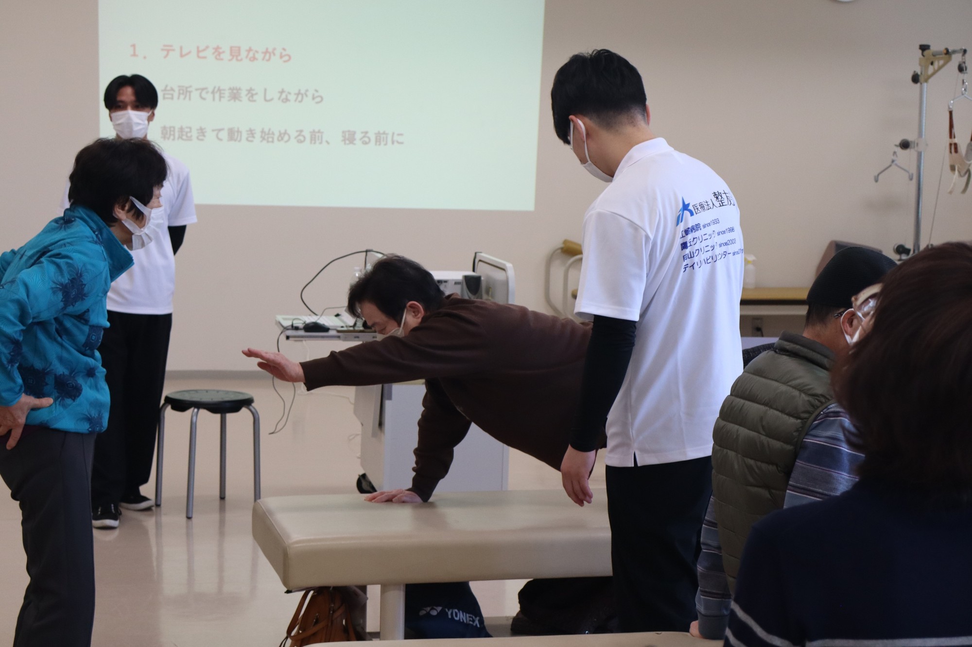 今回は、参加者の皆さんが講演を聞くだけでなく、実際に家庭でも気軽に取り組んでもらえる実技も交えての講座を開講。3つの教室に分かれて、「腰」、「膝」、「肩こり」をテーマに講演と実技を実践してもらいました。