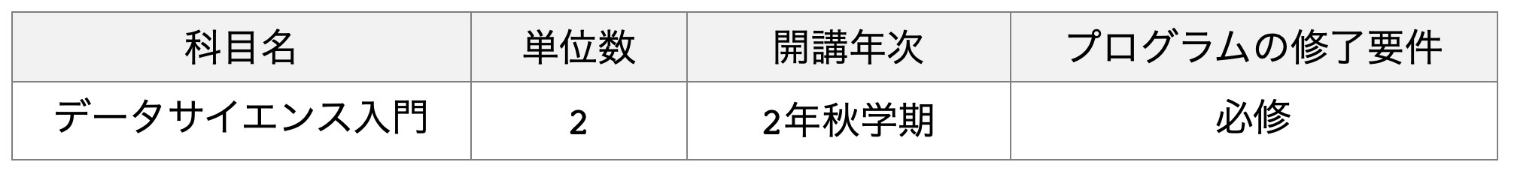 全学共通科目「データサイエンス入門」2単位を修得することを本プログラムの修了要件としています。