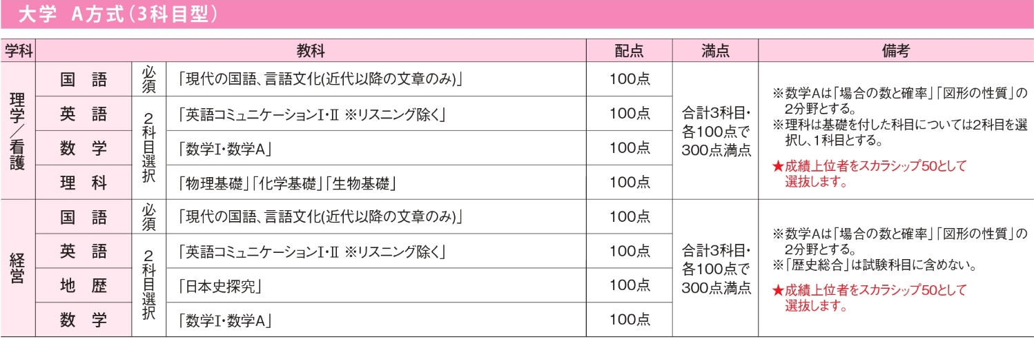 - A方式:3科目型、B方式:2科目型 科目は自由に選択可(短期大学部は2科目のみ)