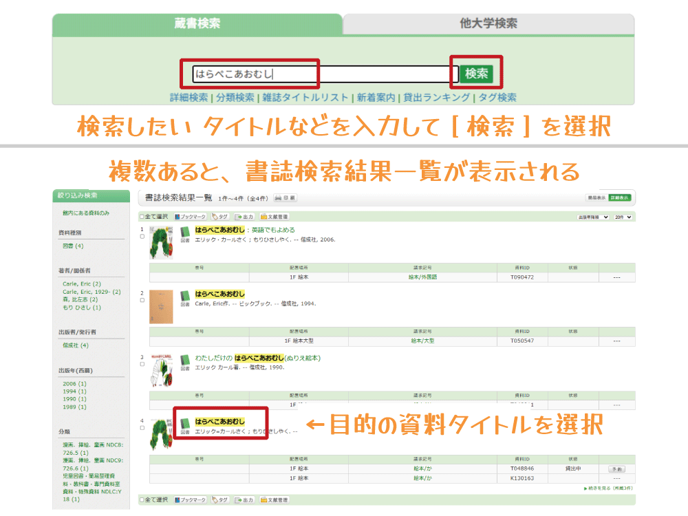② 候補が複数ある場合は、結果一覧から目的の資料を選択し、詳細「所蔵一覧」を表示。
