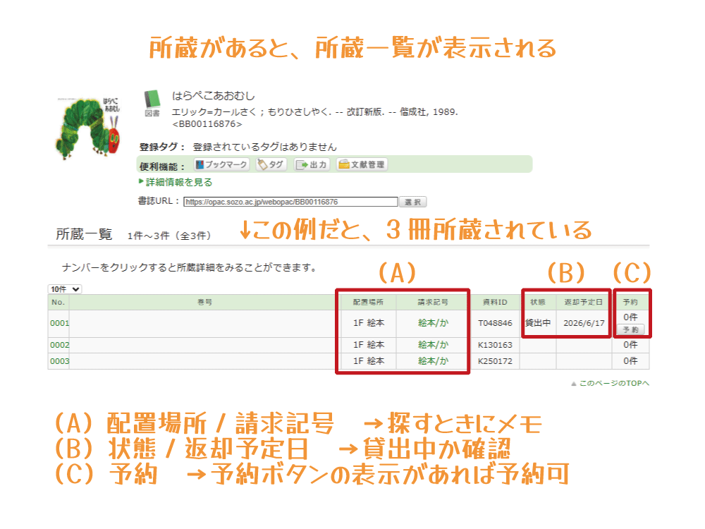 ③ (B) [状態] [返却予定日]を見て、貸出中かどうかを確認。