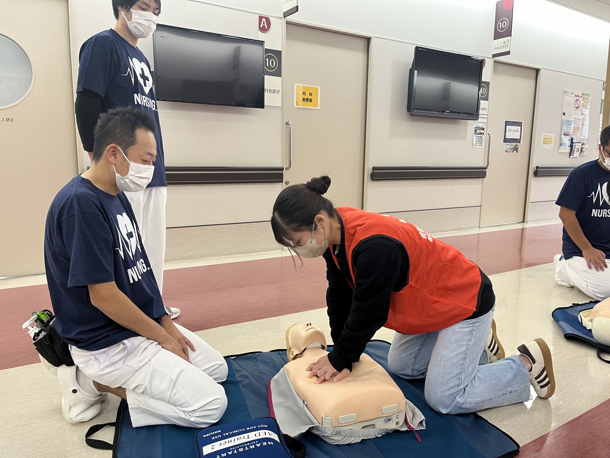 この日は天候にも恵まれ、朝から多くの方が来場されイベントを楽しんでいました。一次救命処置体験にも子供から高齢者まで多くの方が参加されました。学生は、はじめは緊張のためスタッフから声をかけてもらいながら参加していました。その後、慣れてくると積極的に参加者に声をかけ関わっていました。参加した学生は、「楽しかった!また機会があれば参加したいです」「教えることはとても難しいけど、よい経験ができました。」などの感想がありました。医療センターのスタッフの皆様には、事前の研修から当日のサポートまでお世話になりました。ありがとうございました。