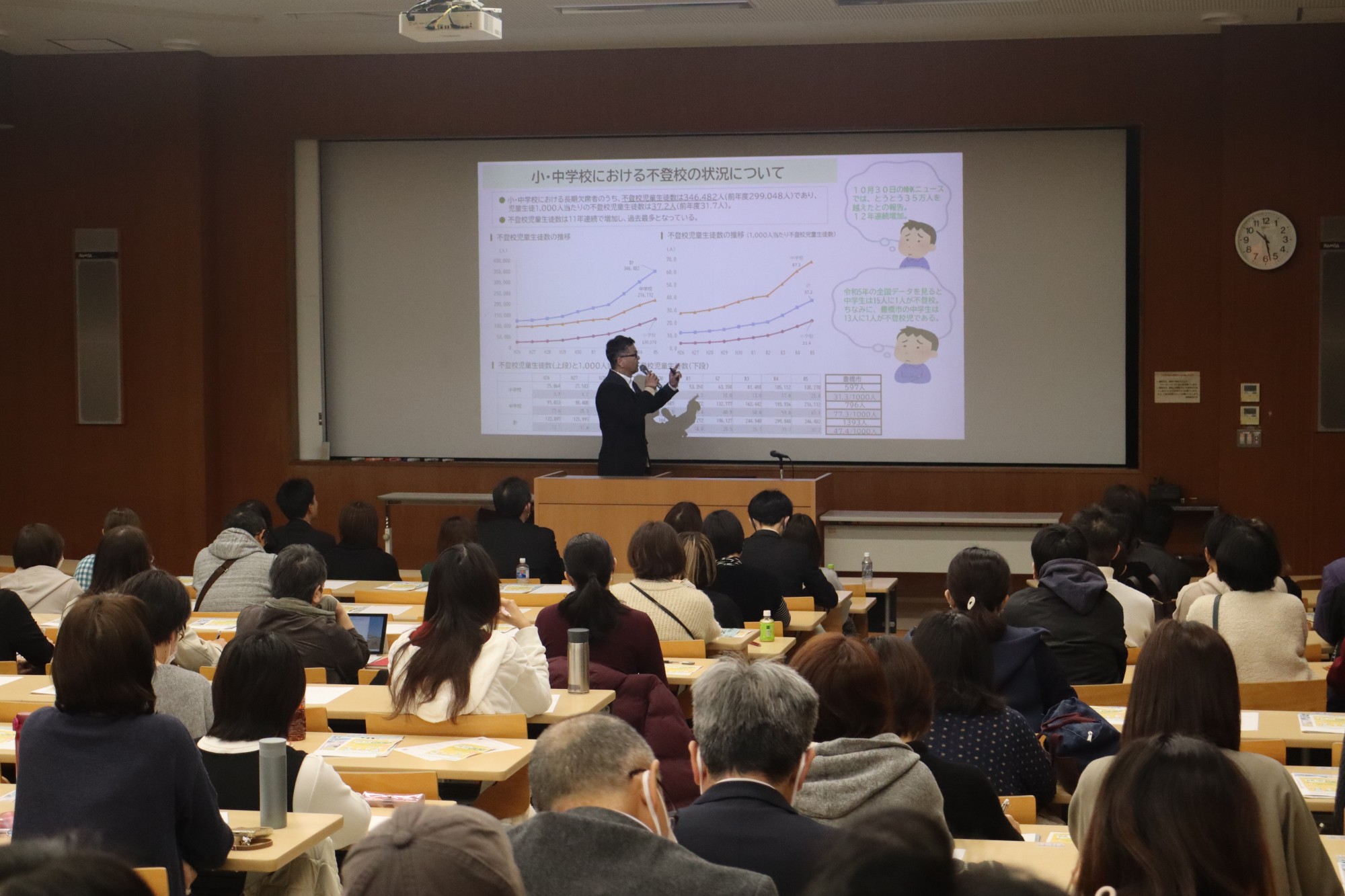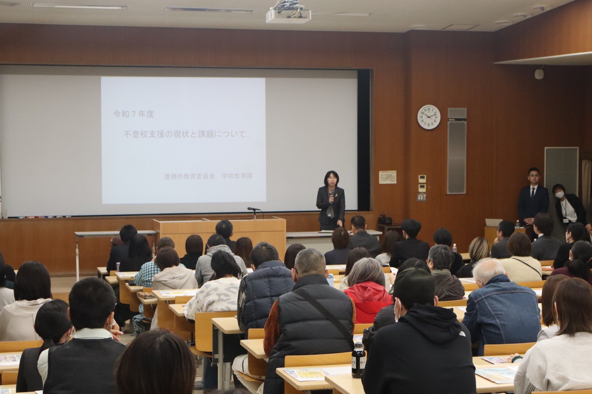 一番目に山岡亜矢指導主事が登壇し、不登校児童生徒数の推移、豊橋市における取り組みの成果と課題について述べ、地域や民間のサポート力の活用など6項目を提案しました。