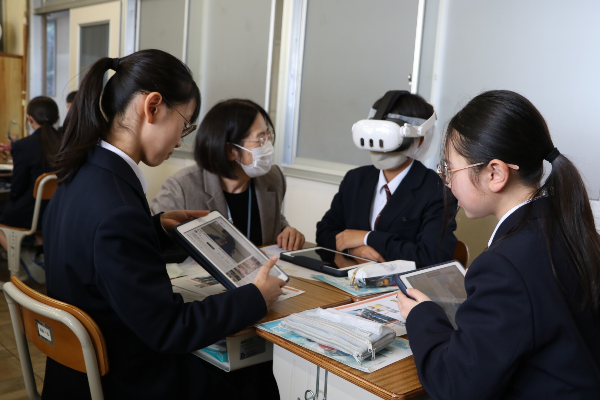 生徒たちはクラスごとに、最新のVR(仮想現実)ヘッドセットを使って教室に居ながら体験するリアルな看護体験と、聴診器で心臓の音を聴く体験をし、教員たちは側に寄り添って指導にあたりました。