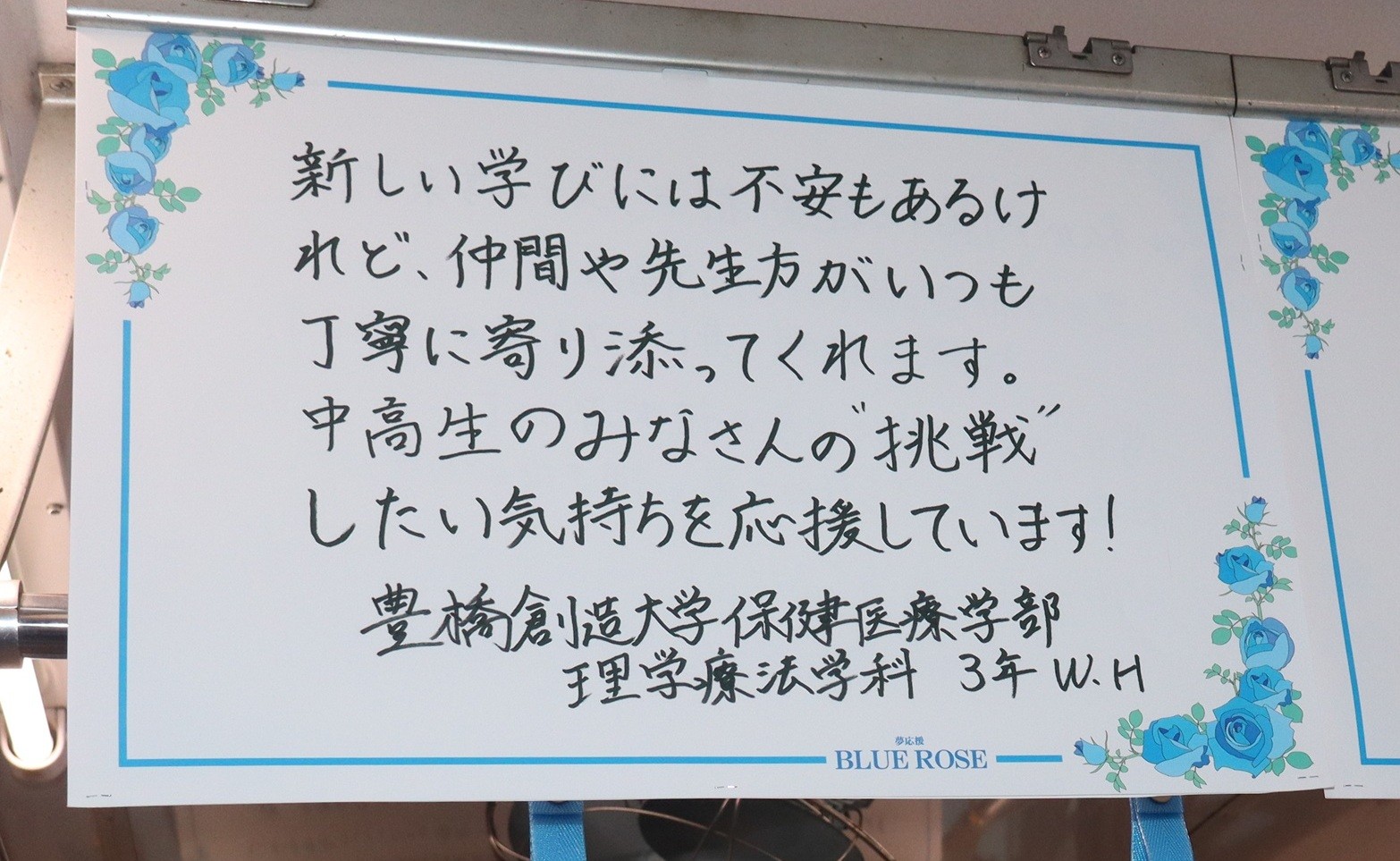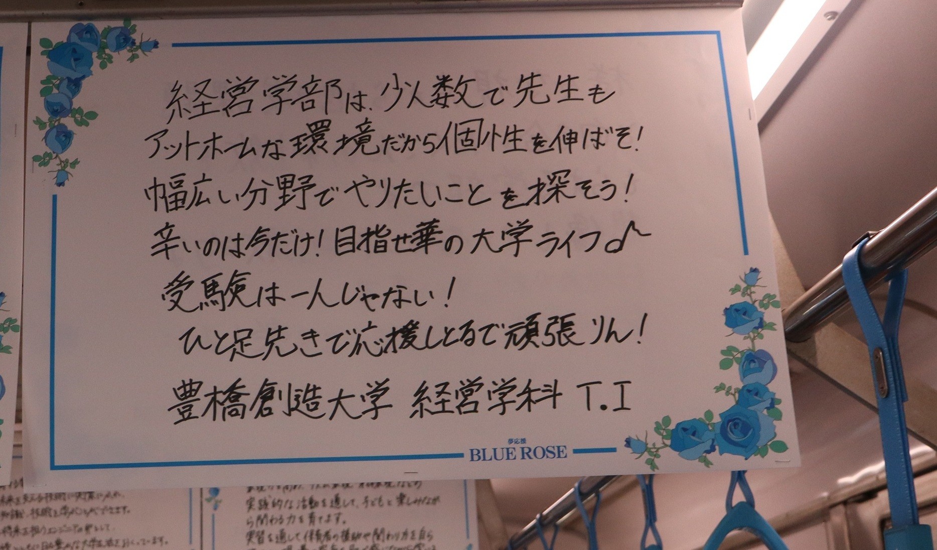 受験生にエール!豊橋鉄道渥美線「夢応援・幸運のBLUE ROSE(ブルーローズ)号」に本学の学生が応援メッセージを投稿