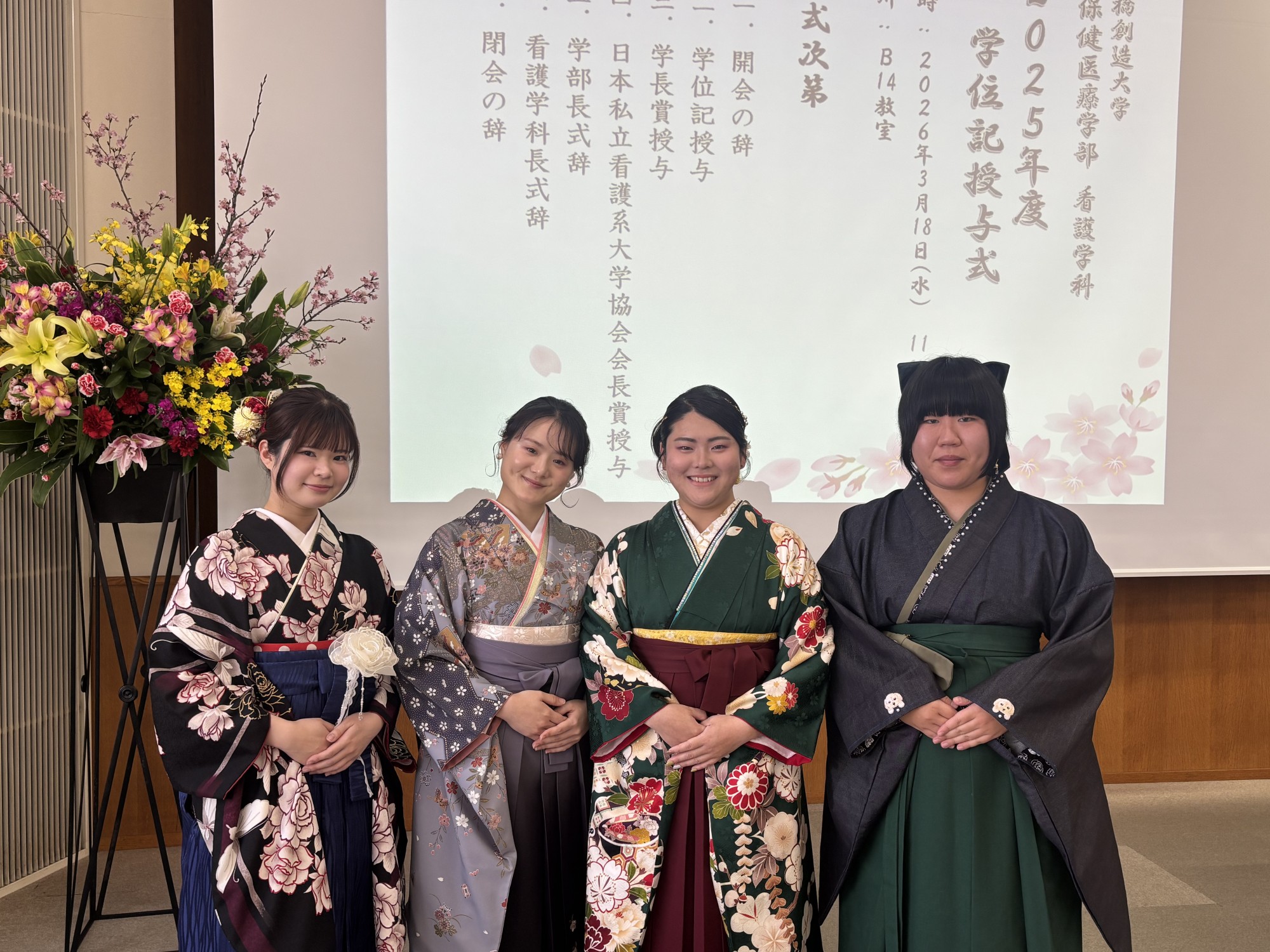 卒業生の皆さんが、社会で活躍する看護職として、それぞれの新たな道を力強く歩まれることを、教職員一同心よりお祈り申し上げます。ご卒業、誠におめでとうございました。