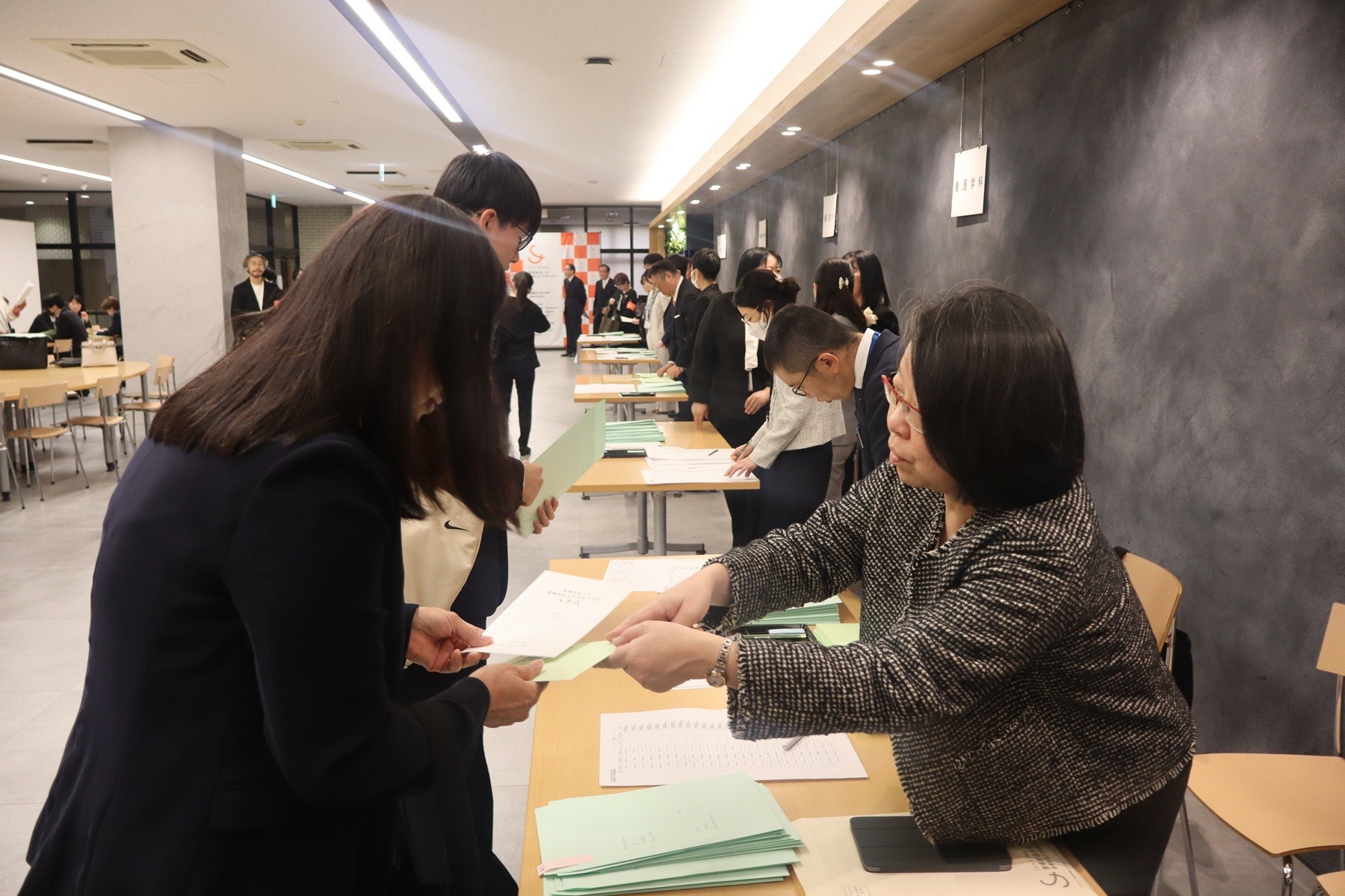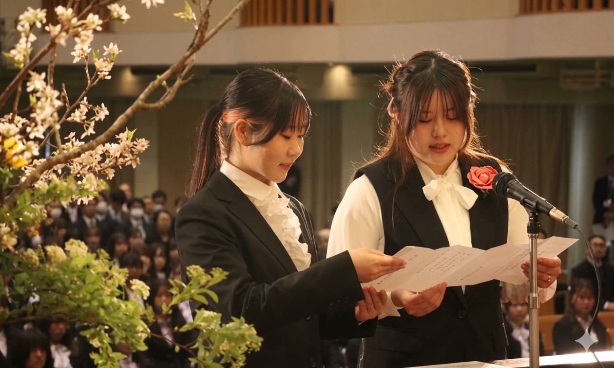 そして、在学生代表(合同学生会会長)からは、「新入生の皆さん、ご入学おめでとうございます。新しい環境への期待や不安は、これからの成長の大切な原動力になります。本学には専門的に学べる環境が整っていますが、学業だけでなく、サークルや行事を通じた「人とのつながり」も自分を大きく成長させてくれます。限られた時間の中で、ぜひ自ら一歩踏み出し、多様な交流を通して自分の可能性を広げてください。私たち在学生も、皆さんが安心して歩めるよう全力でサポートします。一日一日を大切に、実りある学生生活を送ってください。」と「歓迎の言葉」がありました。