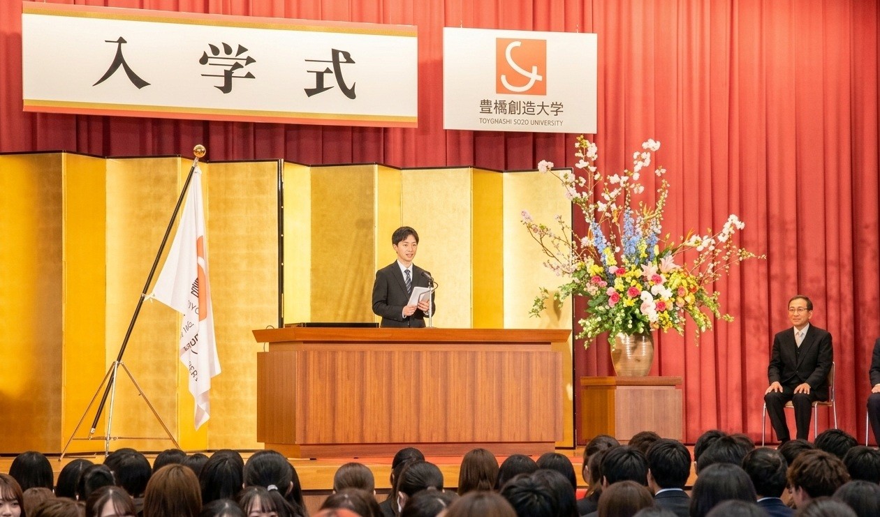 続いて新入生代表は、「春の佳き日に、豊橋創造大学・短期大学部への入学を迎えられたことに感謝いたします。私たちは、少子化や経済、震災など現代社会が抱える複雑な課題に向き合い、将来その解決を担う社会人となるべく、本学への進学を決意しました。