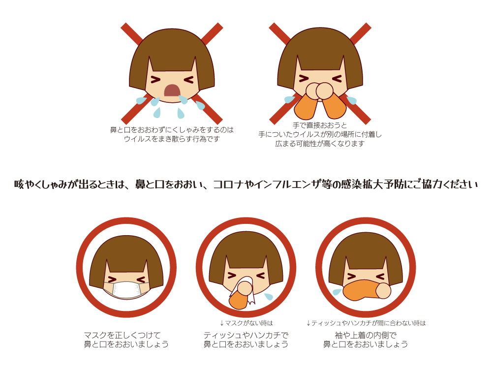 お願い咳やくしゃみが出るときは、鼻と口をおおい、コロナやインフルエンザの感染拡大予防にご協力ください。