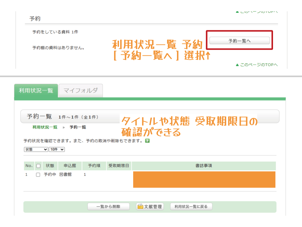 予約冊数が表示されている右側の[予約一覧へ]を選択すると、現在予約している資料タイトル等の確認ができます。