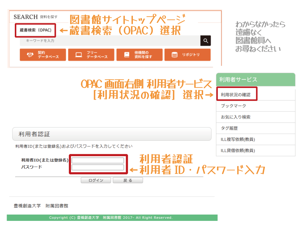 ③OPAC画面右側にある 利用者サービスの[利用状況の確認]を選択。